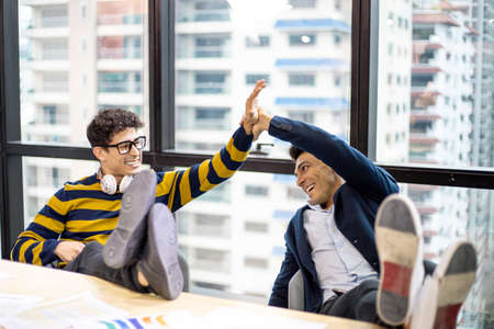 Business team giving a high fives gesture as they laugh and cheer for their success.