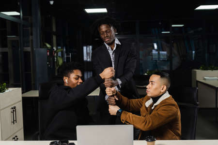 Multiethnical diverse colleagues making hand stack of fists. Black africans and asian working online with laptop in office