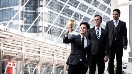 Happy Asian business people with golden trophy cup for their winner in business project. Teamwork and success concept