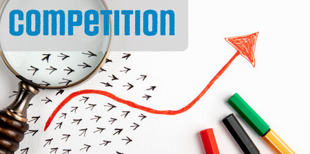 Competition Concept. Direction arrows, colored pens and magnifying glass on white background