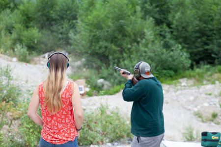 A young women stands behind a man holding a shotgun downrange, shooting clay pigeons to practice aim in British-Columbia