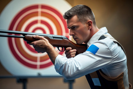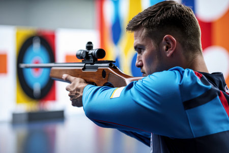 AI Generative Man Athlete Shooting Rifle at Target, Summer Olympic games Championship Competition