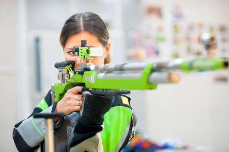 Young woman athlete holding air rifle, preparing for target shooting sport competition, indoor range with wooden background, focus and concentration, determination and precision, training session