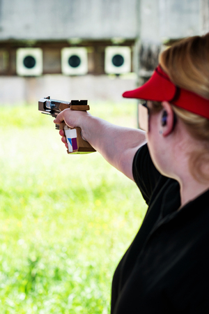 Man with hand gun aiming at shooting range and releasing stress. Selective Focus