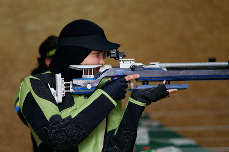 Female athlete wearing professional shooting uniform and hijab carefully aiming with an air rifle at an indoor range.