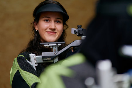 Smiling woman athlete aiming rifle, precision shooting sport. Competitive female shooter with air rifle, focus and determination, wooden background, indoor shooting range, sportswoman.