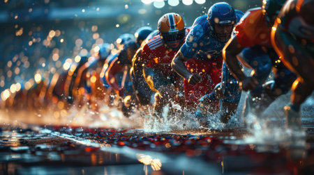 A group of football players are running through a field in the rain. Concept of excitement and determination as the players push through the wet conditions to reach their goal