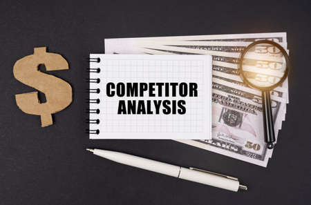 On a black surface are dollars, a pen and a notepad with the inscription - COMPETITOR ANALYSIS