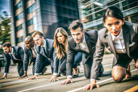 Businessmen and Women in suit ready to run at start point. Successful business concept.