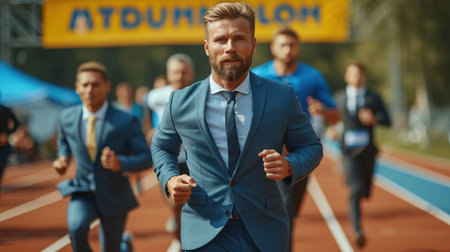 group runner athlete running crosses finish line sprint race, summer athletics championships at stadium