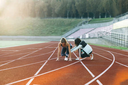 Two sportsman runners on starting position ready for competition in running at the stadium.