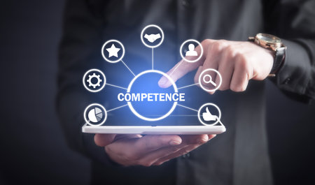 Business, technology, internet and networking concept. Young entrepreneur showing keyword: Competence
