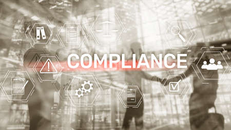 Compliance concept with icons and diagrams. Regulations, law, standards, requirements, audit. Concept on device screen