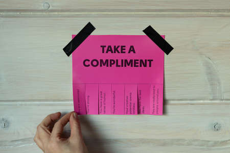 Happy World Compliment Day. Take a compliment. Pink wall paper sticker with text of popular compliments for beautiful lady pasted on wooden background. Creative concept.