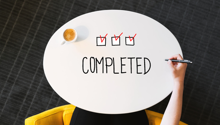 Completed text on a white table with person?s hand