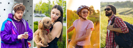 Composite image of photos of young men and women walking together in summer forest, meadow, public park. Lifestyle, friendship, nature