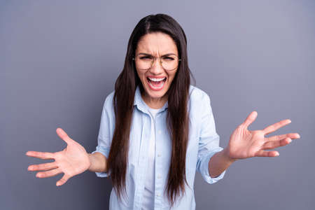 Photo of aggressive angry mature woman wear formal shirt spectacles rising arms isolated grey color background