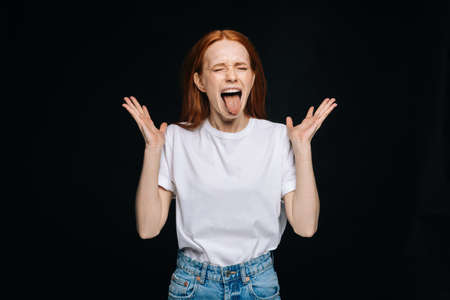 Angry crazy young woman in T-shirt with closed eyes spreads hands to sides and showing tongue on isolated back background. Pretty redhead lady model emotionally showing facial expressions.