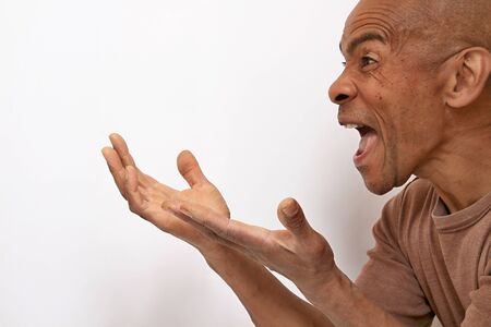 Portrait of young man screaming. Looking up in anger and making angry hand gestures.