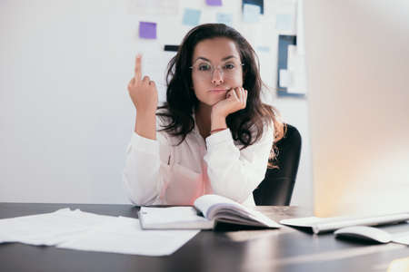 Tired and rude young woman employee showing middle finger to camera. Girl with brown hair showing fuck off expression. Open diary on black desk. Office job or remote job concept.