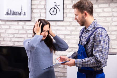 Shocked Woman Looking At Invoice Shown By Male Technician