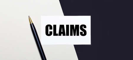 On a black and white background lies a pen and a white card with the text CLAIMS