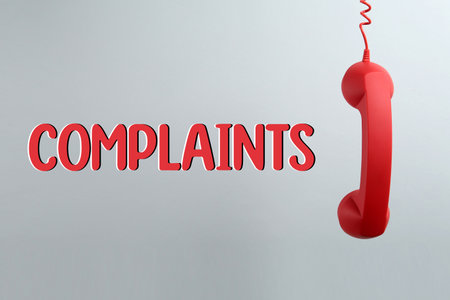 Corded telephone handset and word complaints on light gray background