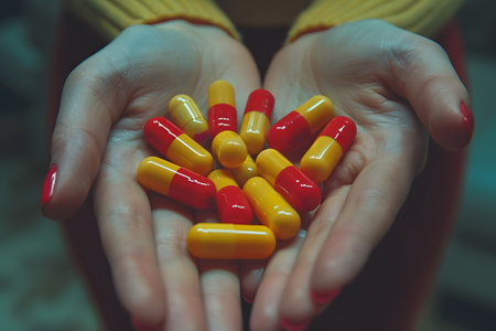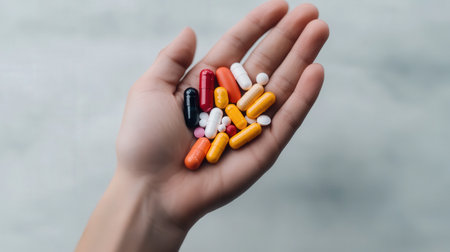 Hand holding colorful pills and capsules for medication.