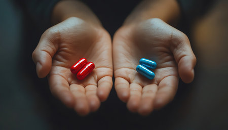 Hands holding a red pill and a blue pill in dramatic lighting, dark background, symbolic and thoughtprovoking choice