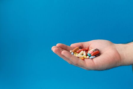 A handful of colored pills on the palm. Medical concept. Shopping at the pharmacy