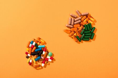 Top view of colorful pills and capsules on orange background