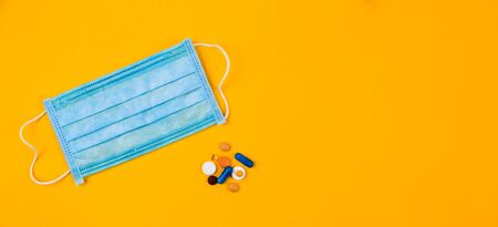 Blue Protective medical mask on yellow background surrounded with colorful pills. Creative concept of healthcare, hygiene, virus protection and medical treatment on coronavirus quarantine