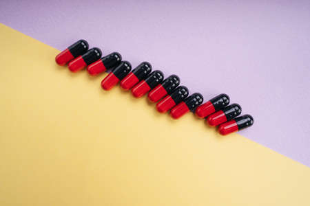 Top view - Black and red medicine pill capsule over pastel background.