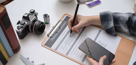 Cropped shot of female filling travel insurance form while looking her travel plan on smartphone