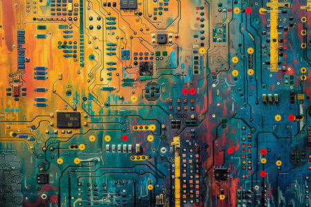 A detailed overhead view of a complex arrangement of electronic components and circuit boards featuring vibrant colors and intricate textures.