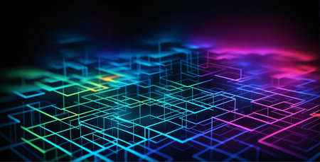 This visually striking digital artwork features an abstract landscape of interconnected geometric shapes, showcasing a futuristic technology theme with vibrant colors and intricate patterns.