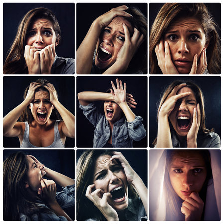 Please...help me. Composite image of a terrified woman screaming.