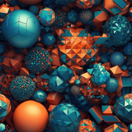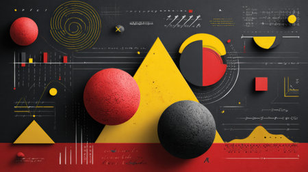 A stunning piece of design artwork presenting a sophisticated array of abstract shapes. This composition highlights a seamless fusion of geometric forms, vibrant colors, and creative patterns,