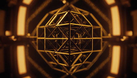 A 3D abstract composition of metallic geometric forms like pyramids, spheres, and layered squares, rendered with warm lighting and sharp shadows.