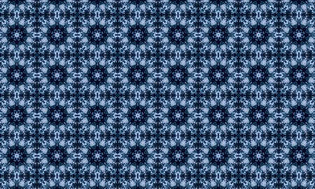 showing an intricate, repeating geometric pattern with a tessellated featuring star shapes and complex interweaving lines in shades of deep blue, teal, and...