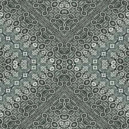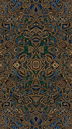 A highly detailed, symmetrical pattern in shades of green and gold intricate floral and geometric creating a rich, ornamental texture.