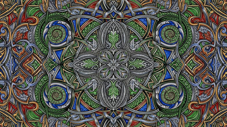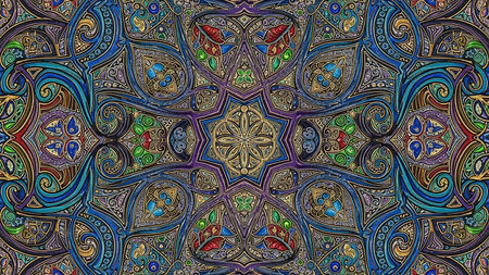 A detailed, symmetrical kaleidoscopic pattern featuring intricate ornate designs in gold, blue, purple, green, and red, creating a vibrant and complex background.