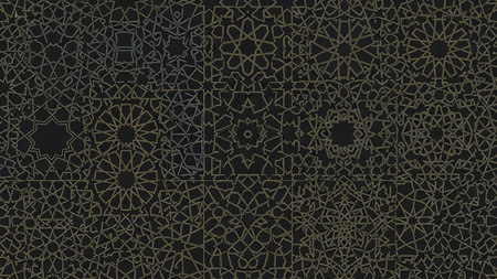 Golden showing a dark background filled with a repeating pattern of golden geometric islamic star shapes and intricate tessellations arranged in a grid.