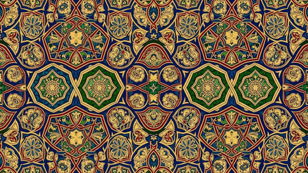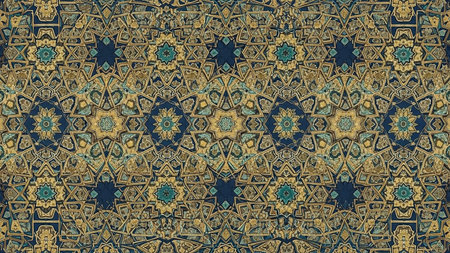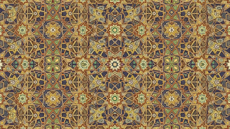 A complex and highly detailed geometric pattern in gold, brown, dark blue, and green intricate star motifs and creates a rich ornamental background.