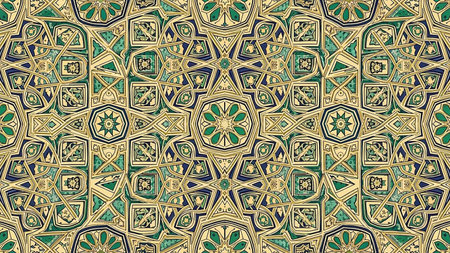 showing intricate geometric islamic pattern with repeating star and octagonal motifs in gold green and blue hues. resolution