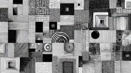 Abstract monochrome pattern collage with geometric shapes and lines