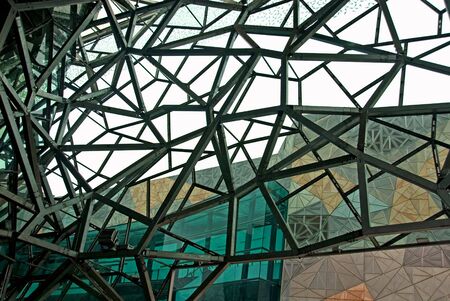 A complex arrangement of metal framework, behind a glass covered building in Melbourne, Australia