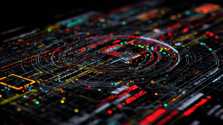 This image showcases an abstract digital data visualization featuring colorful lines and circles on a dark background, ideal for technology and science themes.
