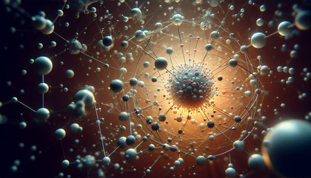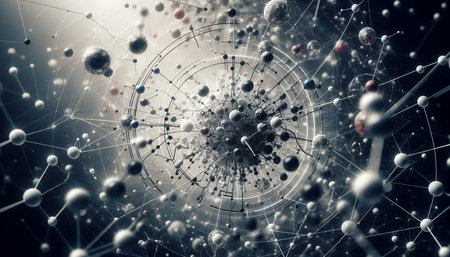 Close-up of interconnected spheres and lines, forming a complex, web-like structure