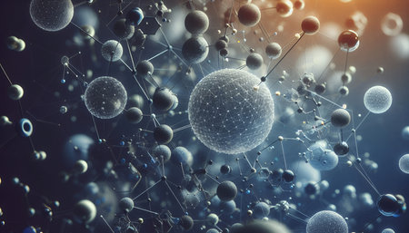 This image presents an abstract illustration featuring numerous spherical biological cells. The composition showcases a variety of colors, including purple, blue, and orange, with intricate textures and highlights. The overall style suggests a microscopic environment. It could be useful in scientific or educational publications, or in designs.